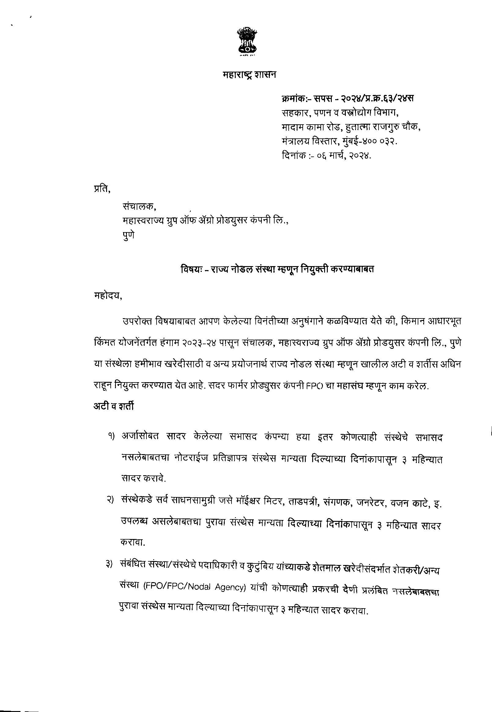 The SLA status will enable Mahaswarajya Group of Agro Venture (Mahaswarajya FPO Federation) to act as a nodal agency for executing procurement operations in collaboration with central and state-level institutions like NAFED, SFAC, NCCF, and the Department of Agriculture.